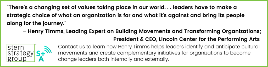 Former President and CEO of New York City’s 92nd Street Y, which was named one of Fast Company’s most innovative companies during Timms’ leadership tenure, he is no stranger to recognizing growing cultural movements and instilling longstanding institutions with modern values and accessibility to all. Timms and co-author Jeremy Heimans outline this dynamic in their 2018 bestselling book, “New Power: How Anyone Can Persuade, Mobilize and Succeed in our Chaotic, Connected Age.”